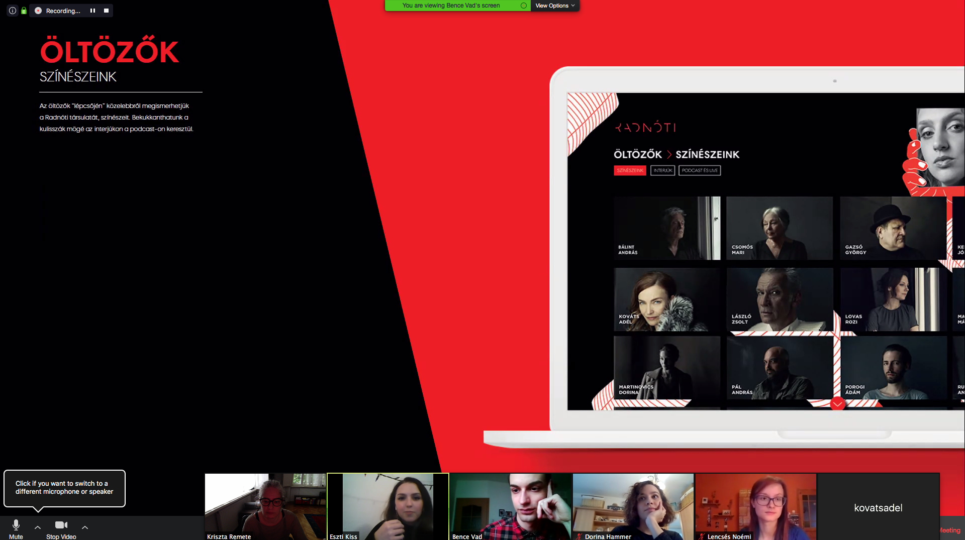 A félév folyamán a Radnóti színház munkatársai konzultációkkal és további ismeretanyag átadásával segítették a projekt fejlesztését. A lezáró online vizsgán a Radnóti Színház igazgatónője, Kováts Adél, valamint a színházkreatív vezetése is jelen volt.